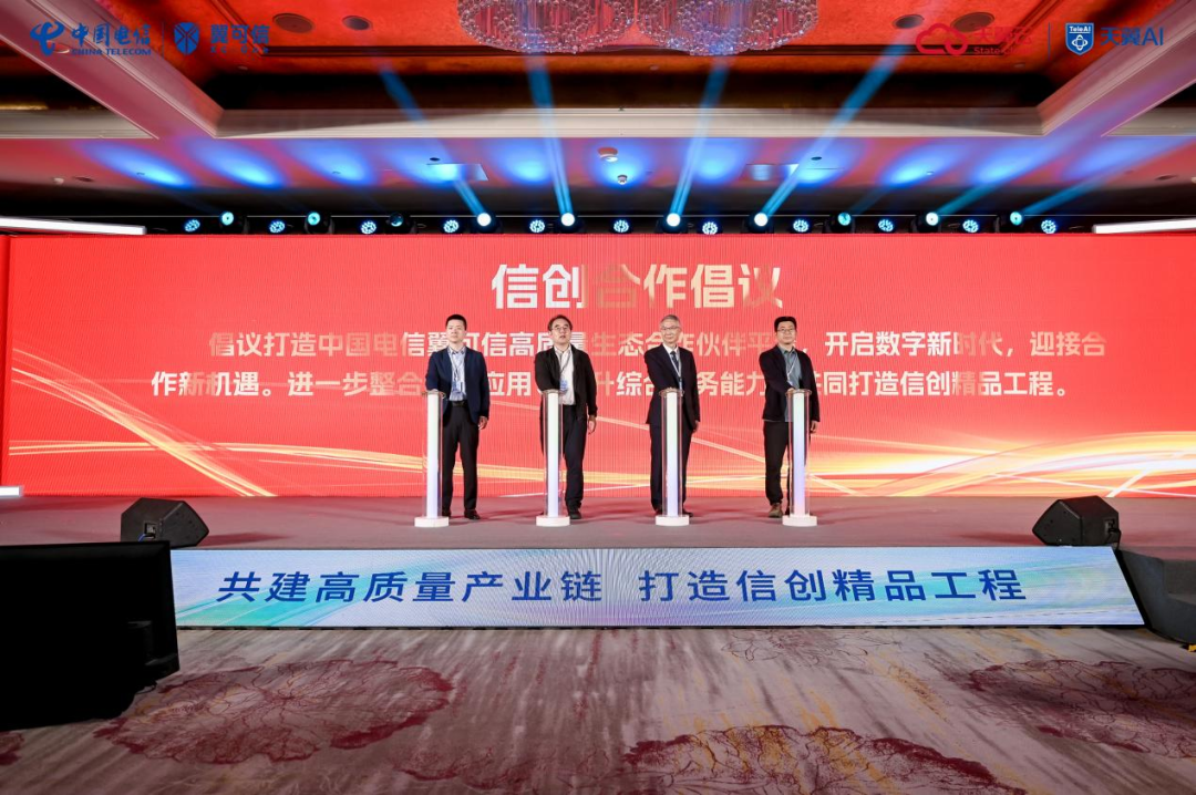 在合作签约环节,中国电信研究院院长张成良、中电信数智科技有限公司总经理李忠、中国日报社技术中心主任甘永清、国家市场监管总局谭敏清联合发起《共建高质量产业链,打造信创精品工程 》中国电信信创合作倡议,倡议打造中国电信翼可信高质量生态合作伙伴平台,开启数字新时代,迎接合作新机遇。进一步整合行业应用、提升综合服务能力,共同打造信创精品工程。