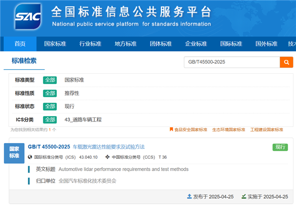 快科技4月30日消息,从禾赛科技官方获悉,4月25日,由国家市场监督管理总局、国家标准化管理委员会批准,禾赛作为牵头单位及第一起草单位主持编制的《车载激光雷达国家标准GB/T 45500-2025》正式发布并实施。