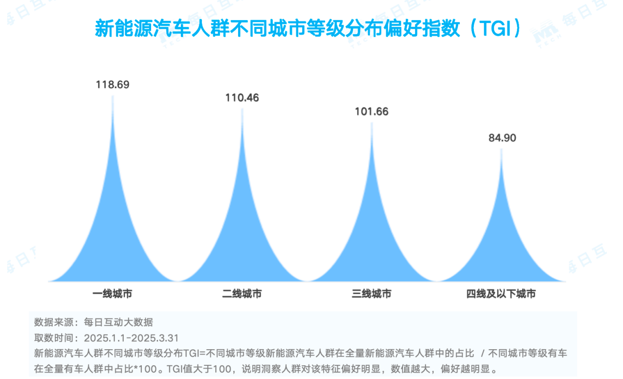 每日互动大数据洞察发现,五菱新能源车用户主要集中在三线城市,其三线城市TGI达到194.45;而蔚来车主更加集中在一线城市。极氪、问界聚焦一、二线中青年群体,依托豪华配置及细分场景定位,满足城市用户对品质与功能的双重需求。