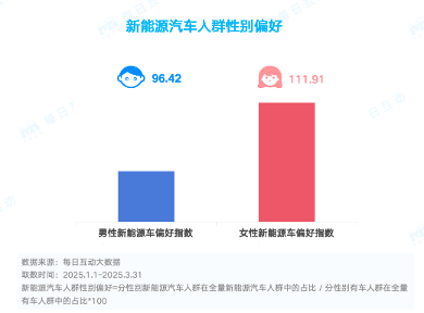 曾几何时,汽车更多是男性用户的“玩具”。但是每日互动大数据洞察发现,来到新能源车时代,相比男性群体,女性用户对新能源汽车的偏好更加明显,对比全量人群中新能源汽车用户群体占比,女性TGI达到111.91,是男性偏好的1.2倍。靓丽的外形、多元的价格、丰富的人机交互以及更多倾向女性用户的实用设计,加上简洁的驾驶技巧,在无形中俘获了更多女性用户的青睐,成为“她经济”的一项美妙诠释。