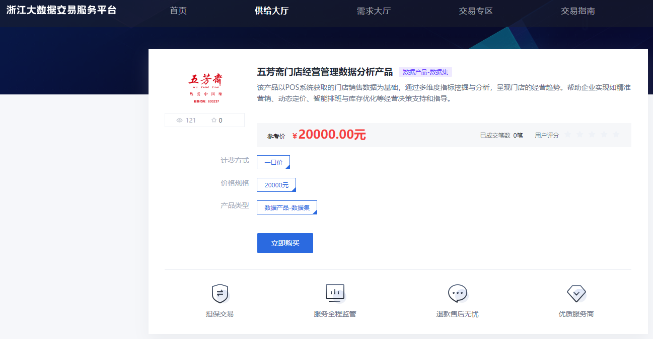 首次在2024年年报中披露相关数据资源的五芳斋,从事传统食品的研发、生产和销售,并提供中式连锁快餐服务。年报显示,五芳斋引入了BI数据统一决策平台,规范数据标准。其数据资产为“五芳斋门店经营管理数据分析产品”,确认为自行生产的无形资产100.04万元。目前,该产品已上架浙江大数据交易服务平台,产品类型为数据集,定价20000元,数据目录主要包括日均客流、谷值收入、订单类型数量占比、支付方式占比等字段。