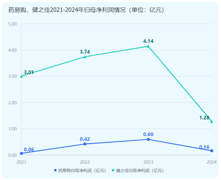 2024年年报显示,药易购和健之佳的归母净利润均出现不同程度的下滑。健之佳2024年的归母净利润为1.28亿元,同比下降69.08%。背后原因是公司整体营业收入增幅趋缓,无法覆盖门店费用的刚性增长,导致净利润较上年同期降幅较大。同样专注于医药流通服务的药易购归母净利润为1635.82万元,同比下降72.52%。