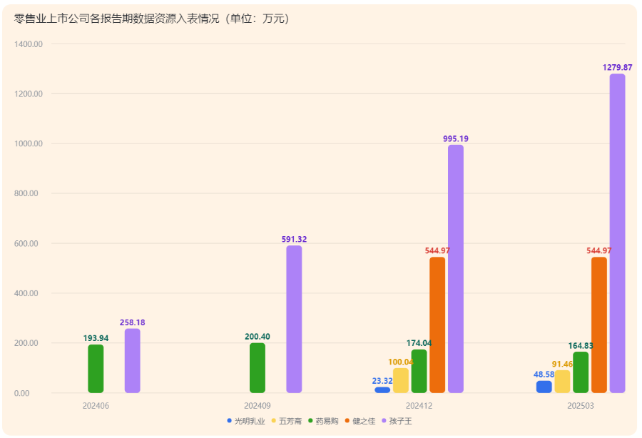 随着2024年年报陆续发布,一系列零售行业上市公司披露相关数据资源情况。药易购(300937)、健之佳(605266)、五芳斋(603237)、光明乳业(600597)、孩子王(301078)五家企业合计披露数据资源达1837.56万元,涉及医药零售、食品餐饮、母婴童商品等不同领域。尽管入表金额各不相同,五家企业均积极布局数据要素赛道,通过自研或外购的方式建立了数字化平台。