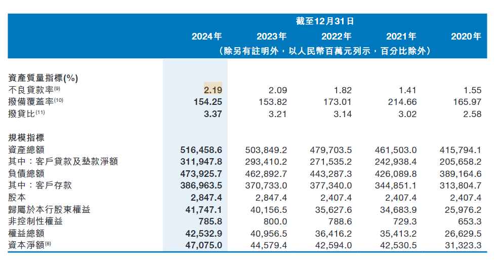 年报显示,截至2024年12月31日,集团资产总额为人民币5164.59亿元,较上年末增加人民币126.09亿元,增幅2.5%,主要是由于客户贷款及垫款及金融投资增加。集团负债总额为人民币4739.26亿元,较上年末增加人民币110.33亿元,增幅2.4%。客户存款总额为人民币3869.64亿元,其中定期存款占比60.2%、活期存款占比29.1%。客户贷款及垫款总额为人民币3208.35亿元,较上年末增加人民币192.10亿元,增幅6.4%。截至报告期末,本集团正常类及关注类贷款总额人民币3138.23亿元,占比97.81%;不良贷款总额为人民币70.12亿元,不良贷款率2.19%。