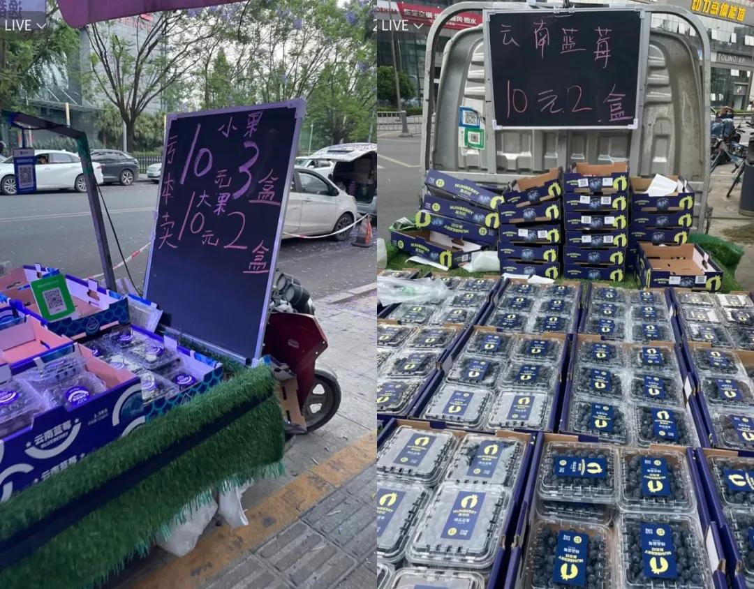 蓝莓从冷藏柜里的“精品标配”走向街边摊的“清仓促销”,一盒只卖9.9元,甚至10元两盒;
