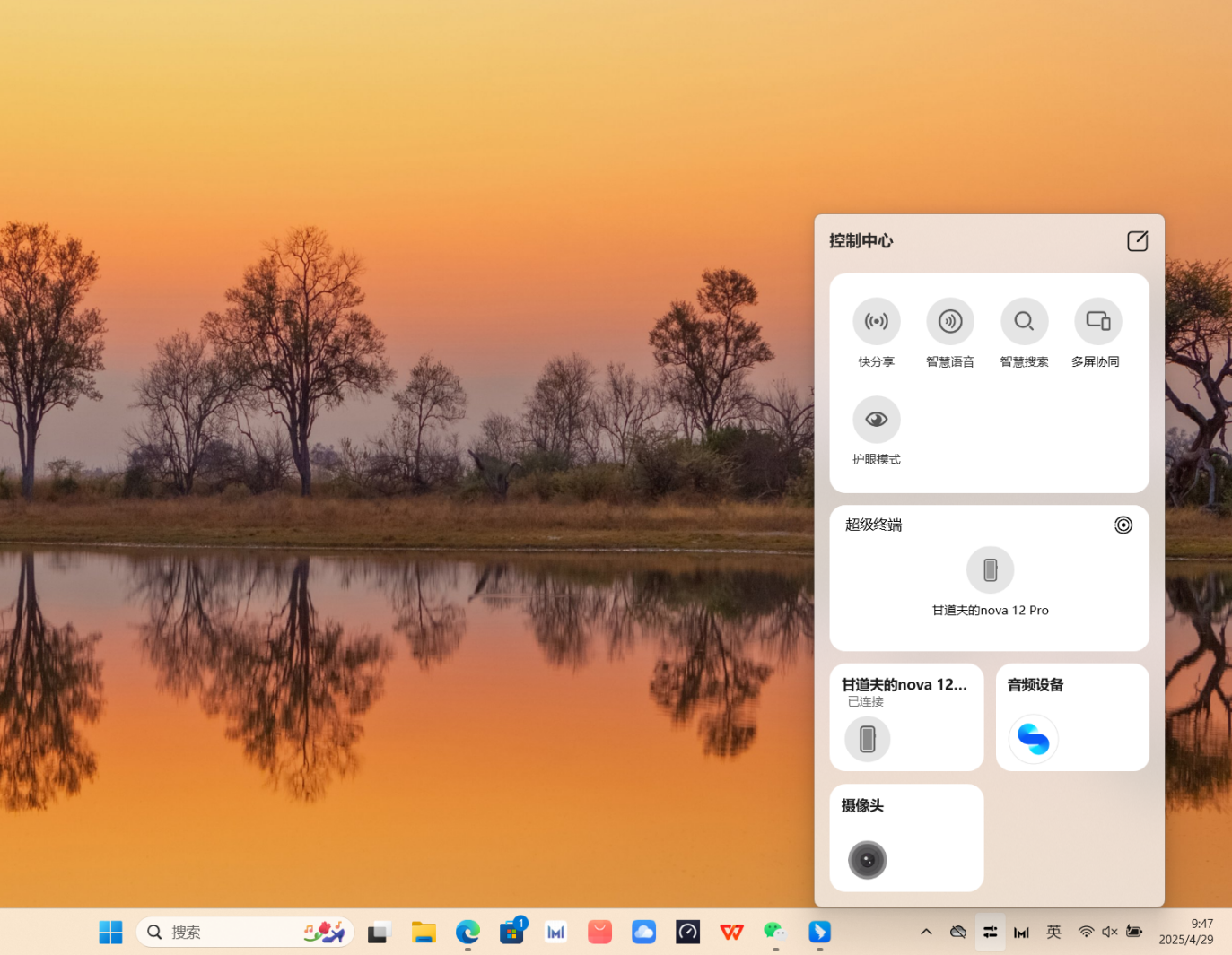 AI时代的到来改善了我们办公体验,在日常办公或者居家办公时,我们经常会遇到没有会议室或者卧室不方便入镜等情况,影响会议体验。此时通过Hi MateBook D 16自带的AI慧眼功能,利用AI算法,我们可以将人物智能抠图到所选择的虚拟背景中,一定程度上守护了个人隐私安全。在任务栏右下角的控制中心里我们可以点击摄像头来开启AI慧眼界面。