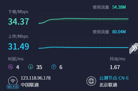 为了模拟在公共区域的网络连接,我们连接上了公司使用人最多的公共网络,同时上百人使用,单个设备的网速上限大概在6MB/s左右,并且选择最角落的会议室中进行测试,此时下载速率34.37Mbps、上传速率31.49Mbps,时延分别为4ms(闲时)和35ms(下载)以及6ms(上传),在阻挡如此多的环境下,超材料天线带来的网络质量还是不错的。