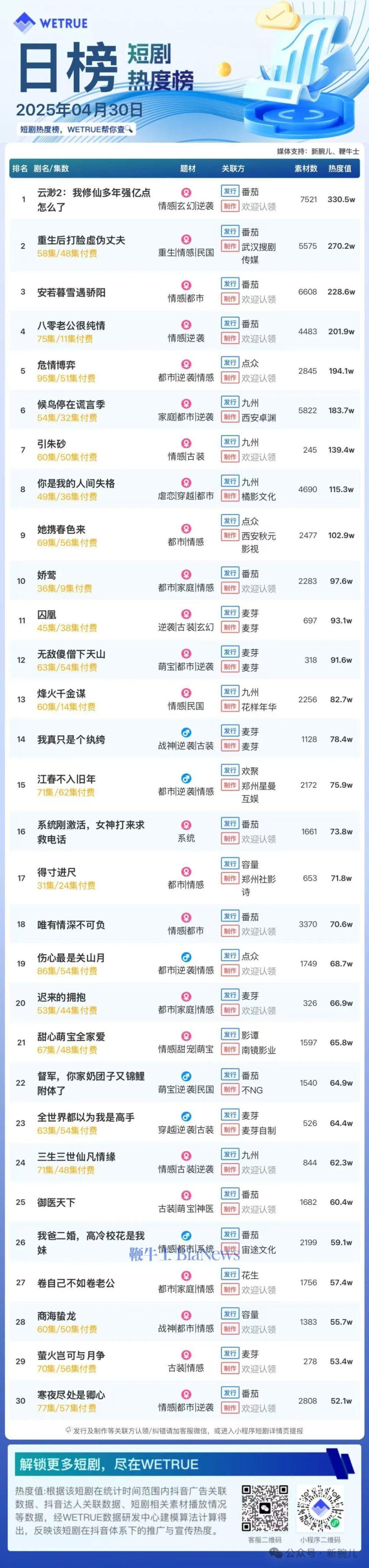 1、本日榜为WETRUE短剧数据公司提供,新腕儿和鞭牛士提供联合支持。