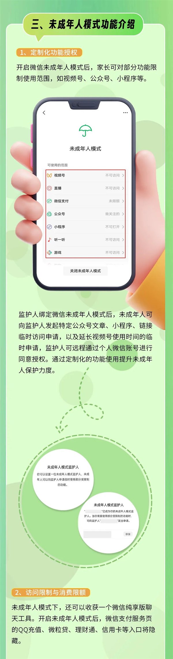 监护人绑定微信未成年人模式后,未成年人可向监护人发起特定公众号文章、小程序、链接临时访问申请,以及延长视频号使用时间的临时申请,监护人可远程通过个人微信账号进行同意授权。