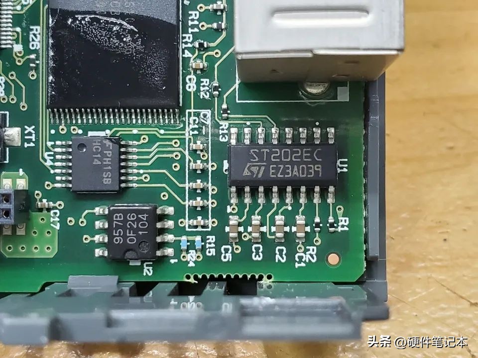 通过232接口进来的第一个芯片ST202EC,一颗来自意法半导体的RS232收发器,5伏供电,可以满足所有EIA/TIA-23E和CCITTV2.8规范,数据速率高达230kbps。