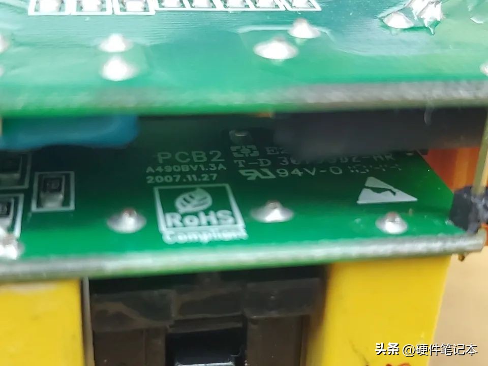 打开外壳看到背部几乎没有元器件,只有显示模块的LED灯。标签上应该是生产日期110411,差不多这个时候的老设备了。