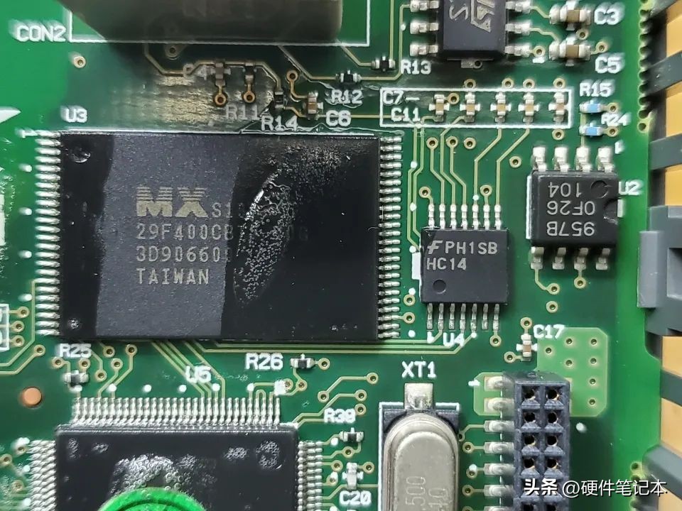 一颗麦克隆生产的4M闪存,单电源供电操作,4.5~5.5V,用于读取擦除和编程操作。擦除暂停擦除恢复,暂停扇区擦除操作,从另一个未被查出的扇区读取数据或将数据编程到另一个扇区。右边那个14针脚的HC14,是Fairchild仙童公司生产的一颗逻辑芯片。再往右的一颗957B功能没找到……