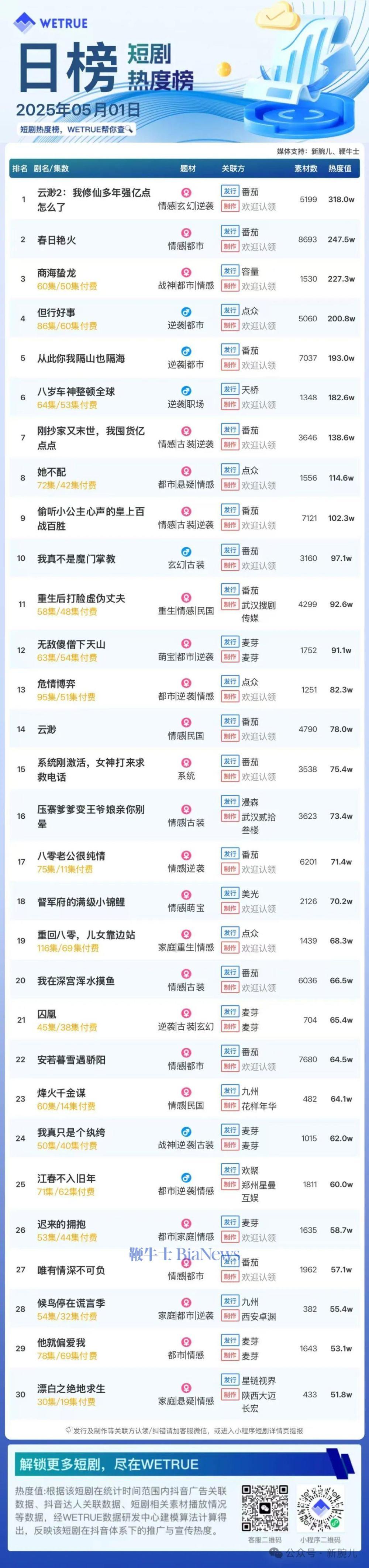 1、本日榜为WETRUE短剧数据公司提供,新腕儿和鞭牛士提供联合支持。