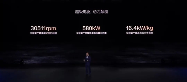 超过 3 万转的最大转速、580kW 的最大功率还有 330kW 的额定功率。几乎可以这么说,这台后桥电机就是现在业内量产最强的驱动电机,没有之一。