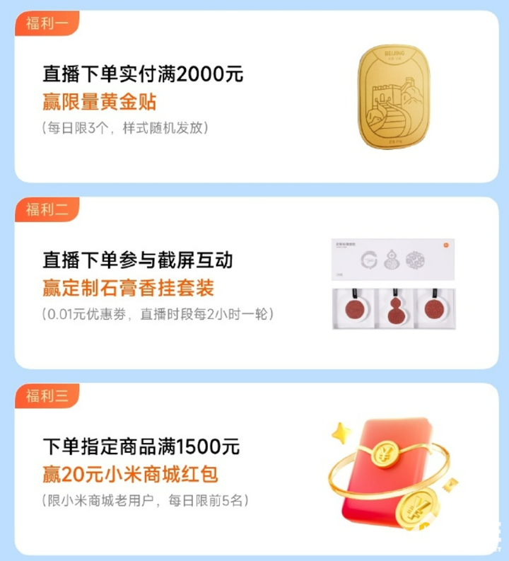 小米宣布五一期间在小米商城直播间有超多惊喜福利,让用户的出行装备一站购齐。实付满2000元,还有机会获得限量城市黄金。