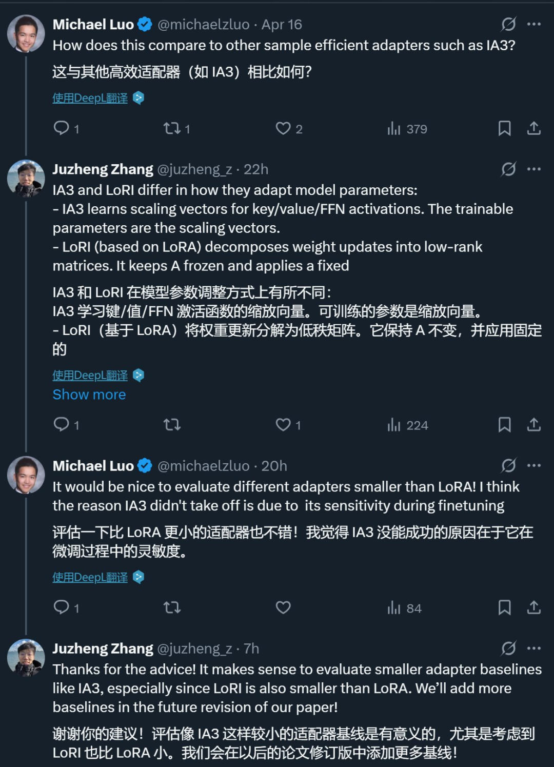 在作者推文评论区,有人问这个方法和之前的方法(如 IA3)有何不同。作者回复称,「IA3 和 LoRI 在调整模型参数的方式上有所不同:IA3 学习键/值/FFN 激活的 scaling 向量。可训练参数就是 scaling 向量。LoRI(基于 LoRA)将权重更新分解为低秩矩阵。它将 A 保持冻结,并对 B 应用固定的稀疏性掩码。所以只有 B 的未掩蔽部分被训练。」