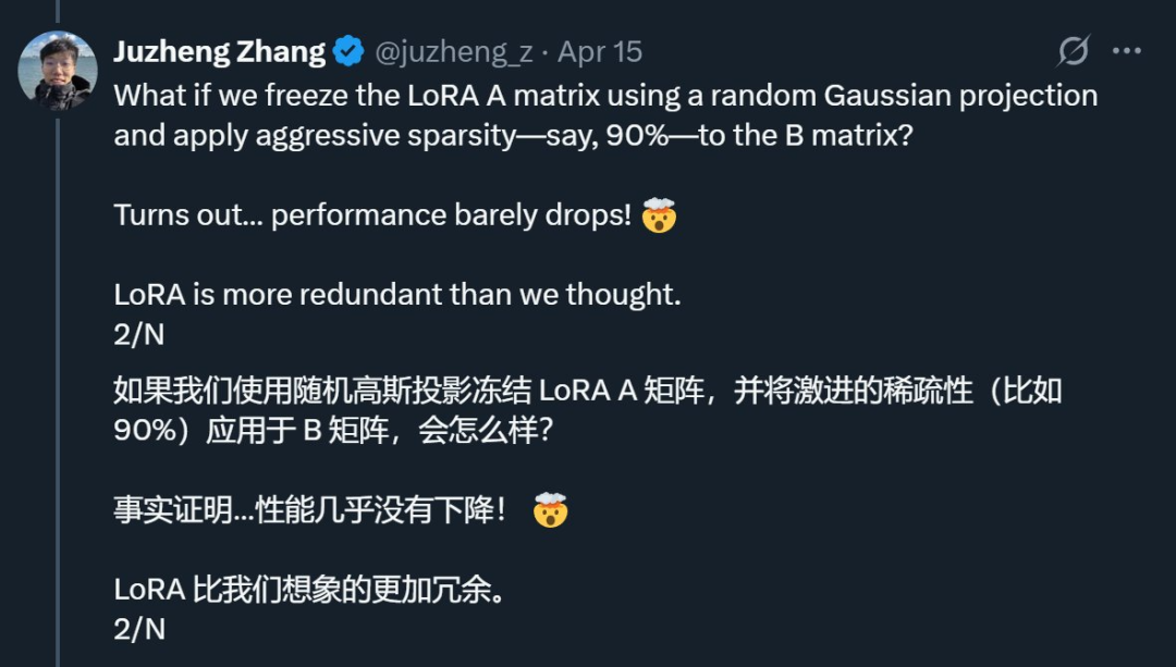 LoRA 中到底存在多少参数冗余?这篇创新研究介绍了 LoRI 技术,它证明即使大幅减少 LoRA 的可训练参数,模型性能依然保持强劲。研究团队在数学推理、代码生成、安全对齐以及 8 项自然语言理解任务上测试了 LoRI。发现仅训练 LoRA 参数的 5%(相当于全量微调参数的约 0.05%),LoRI 就能匹配或超越全量微调、标准 LoRA 和 DoRA 等方法的性能。