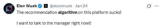 今年1月,马斯克曾抱怨称“这个X平台的推荐算法烂透了,我想立刻和管理者谈谈!”