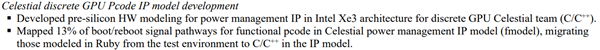 同时,用于xe3显卡的电源管理单元的预芯片硬件模型,也已经建立起来,并完成了从Ruby语言向C/C++语言的启动、重启信号路径的迁移。