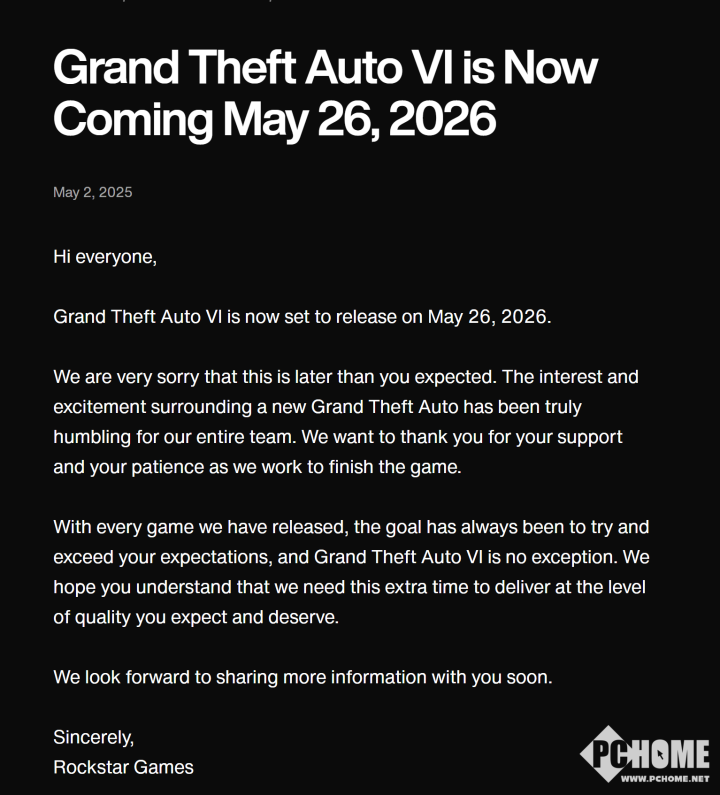 Rockstar Games宣布《侠盗猎车手6》将延期发售,推迟到2026年5月26日。