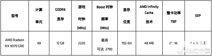 Radeon RX 9070 GRE采用基于RDNA 4架构的Navi 48 GPU,但是核心规模相较RX 9070进一步阉割,仅剩48个计算单元(CU)、3072个流处理器,的整体规格大致相当于完整Navi48的四分之三,Infinity Cache缓存容量为48MB。RX 9070 GRE的显存位宽为192-bit,其显存等效速率也从20Gbps降至18Gbps,最高显存带宽缩水至432GB/s。