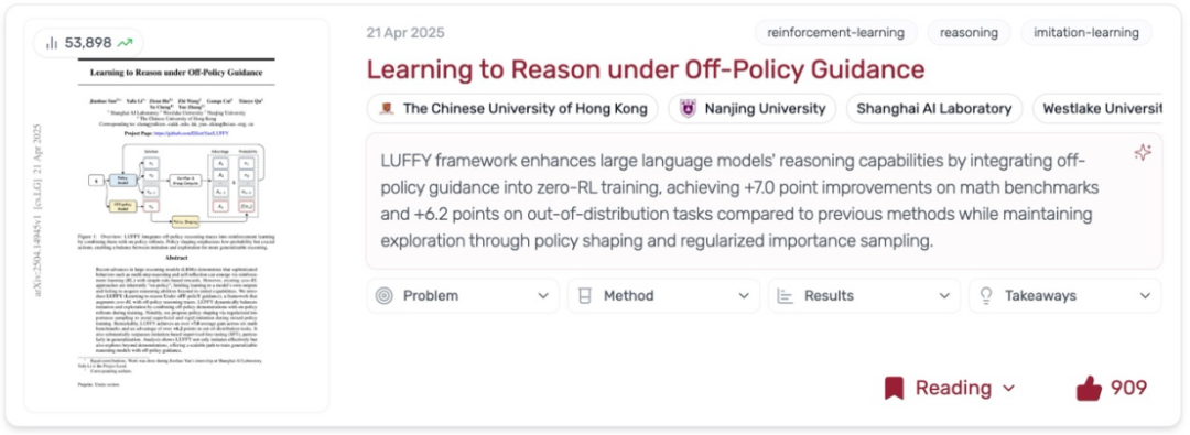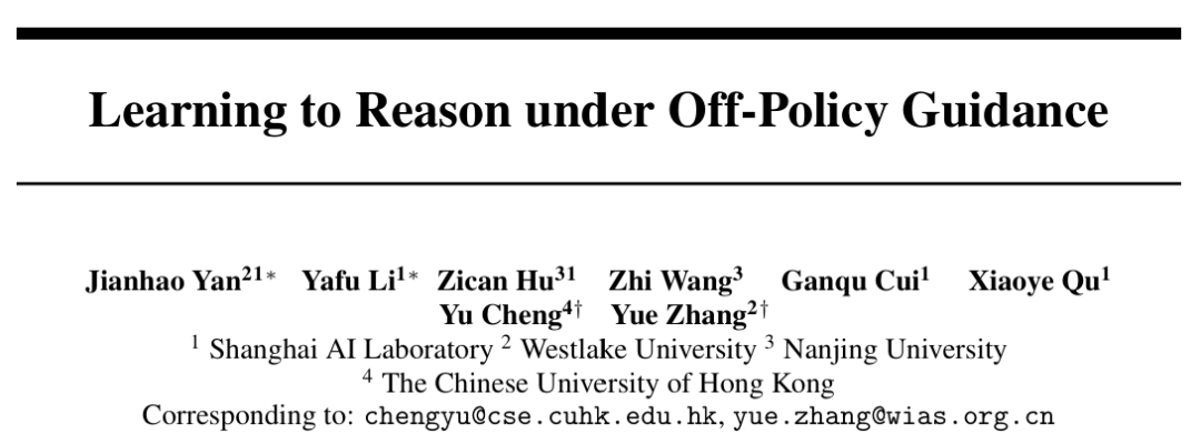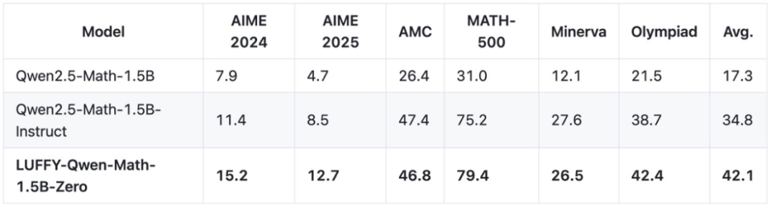 这两种「只学不练」和「只练不学」的策略各有弊端:前者往往学得快但泛化差,后者可能探索勤但效率低。那么,有没有两全其美的办法,让模型既能借鉴高手经验又能保持自主探索?最近,上海 AI 实验室联合西湖大学、南京大学和香港中文大学的研究团队提出了一种全新的强化学习范式:LUFFY(Learning to reason Under oFF-policY guidance)。