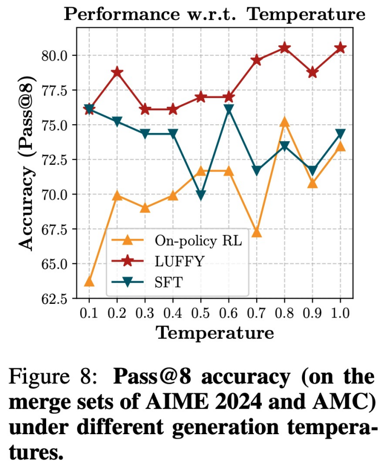 不仅如此,LUFFY 在「推理路径长度」上也明显优于 SFT。在相同准确率下,LUFFY 能用更短的推理过程达成正确答案,减少无效展开;而在测试时调高温度以增加探索强度时,LUFFY 的性能依然保持稳定,而 SFT 则出现明显下降。
