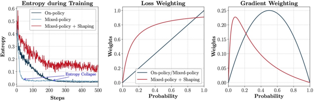 图表 5. 策略塑形在 LUFFY 中的作用效果。左图:训练过程中的策略熵对比。中图:不同方法下损失函数基于决策概率的权重分配。右图:基于决策概率的梯度加权情况对比。LUFFY 通过非线性权重提升了对罕见(低概率)但重要行为的梯度响应,进而引导模型更有效地从 off-policy 示范中习得深层推理模式。