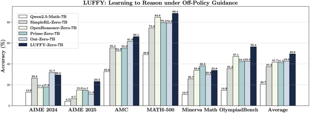 图表 1. 在六项竞赛级数学推理基准上的整体表现。在 AIME 2024、AIME 2025、AMC、MATH-500、Minerva Math 和 OlympiadBench 六个高难度基准测试中,LUFFY 取得了平均 49.6% 的准确率,较现有 Zero-RL 方法实现了超过 + 7.0 分的显著性能提升。