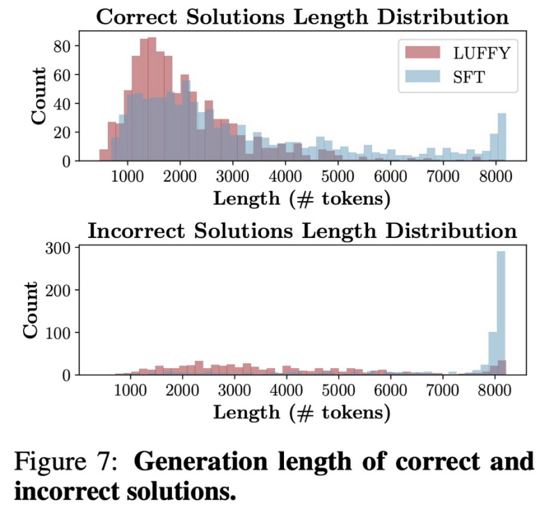 图表 7. 训练动态分析:训练初期,LUFFY 模型逐步适应外部指导,推理路径长度逐渐接近离策略轨迹,表现出有效的模仿与调整。同时,在整个训练过程中,LUFFY 始终保持了较高的策略熵,展现出持续探索的能力。而对比来看,传统 on-policy RL 的熵在早期迅速收敛,探索能力下降。
