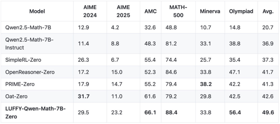 LUFFY 的核心理念是:在训练过程中让模型同时借助高手的推理轨迹进行学习(离策略示范),又能继续独立地试错探索(在线推理),从而实现 「边学边练,学以致用」的目标。实验显示,LUFFY 在多个数学推理挑战任务中实现了平均 + 7.0 分的性能飞跃,并在分布外任务上展现出显著的泛化能力。