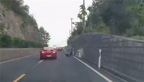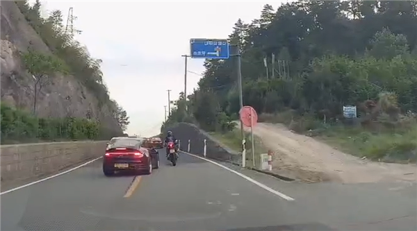 从行车记录仪拍摄的画面看,事发地点应该位于某条山路,车流量不小,看起来有几辆车应该是在组团跑山,此外还有一名摩托车骑手也在正常行驶。