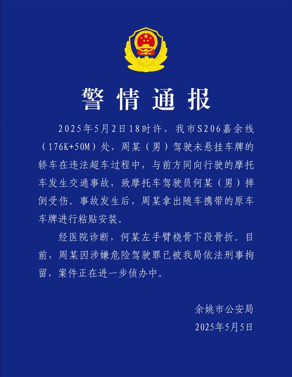 2025年5月2日18时许,我市S206嘉余线(176K+50M)处,周某(男)驾驶未悬挂车牌的轿车在违法超车过程中,与前方同向行驶的摩托车发生交通事故,致摩托车驾驶员何某(男)摔倒受伤。