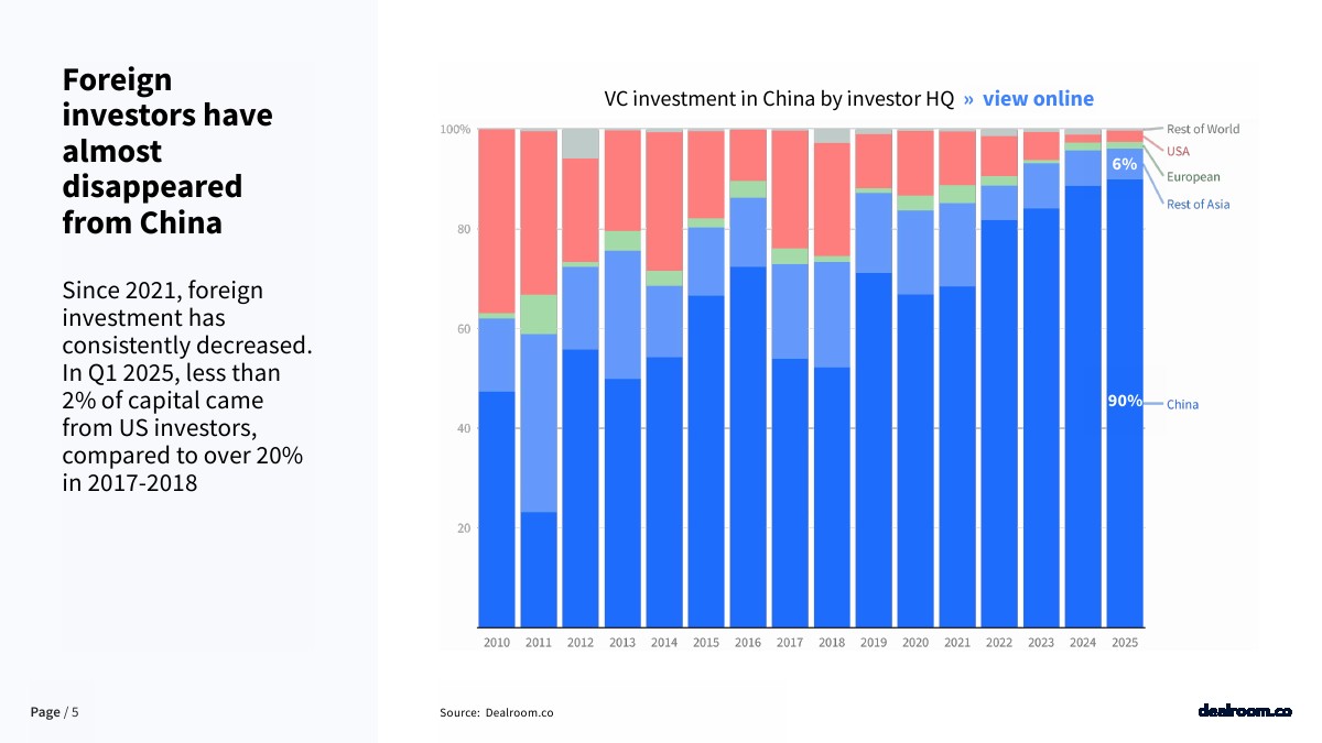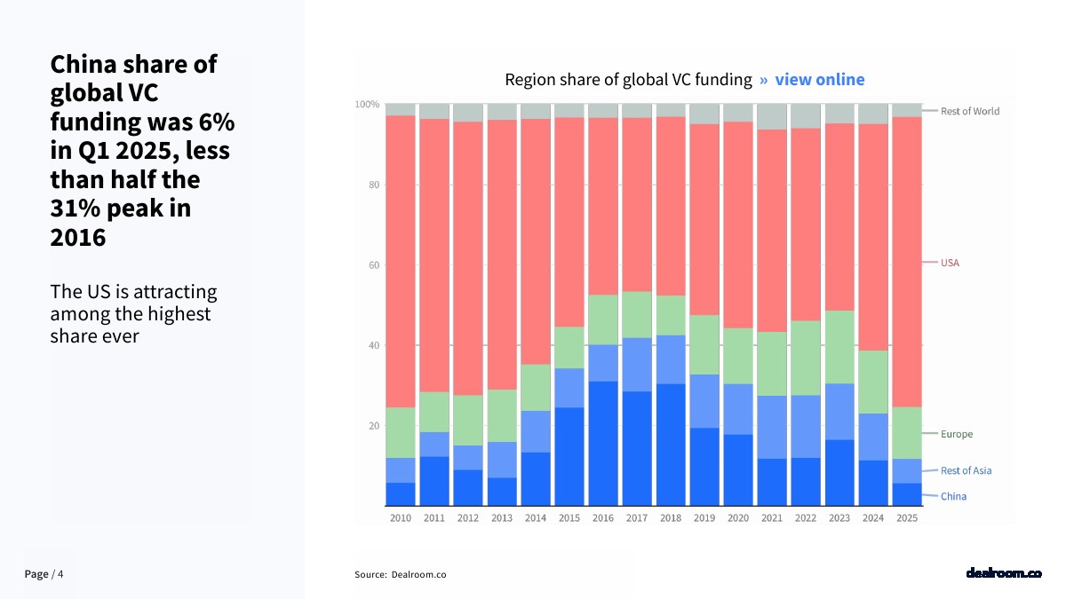 2025年第一季度中国占全球风投份额为6%。不足2016年31%峰值的一半。美国正吸引创纪录的风投资金份额。