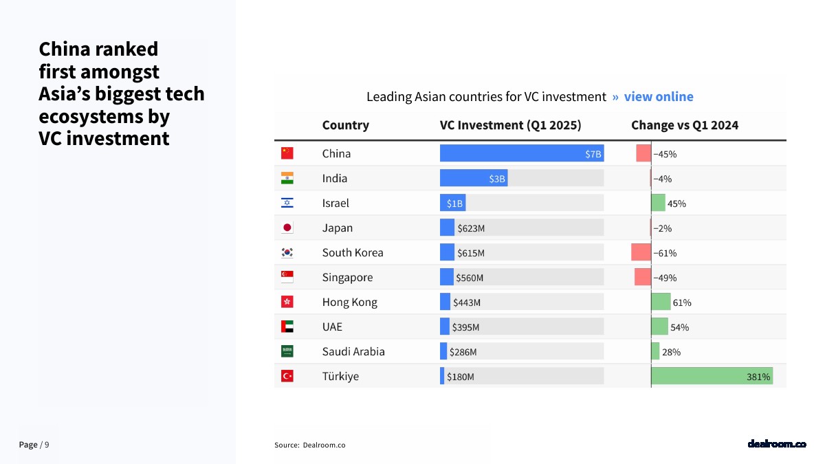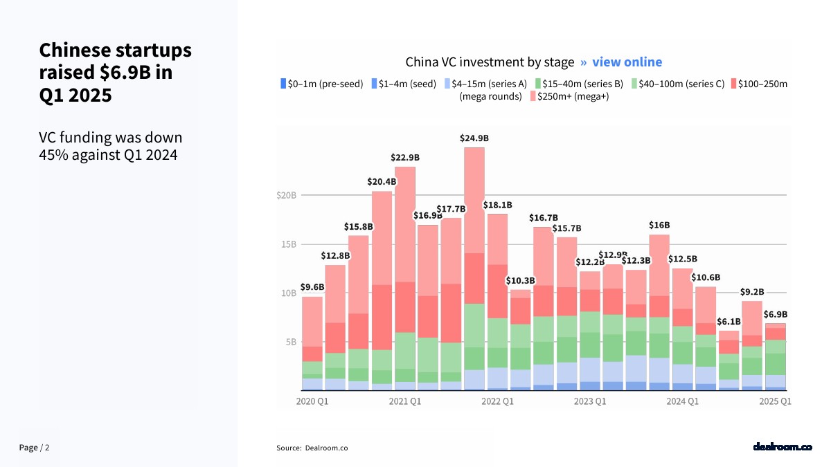 2025年第一季度中国初创企业融资69亿美元。风险投资金额较2024年第一季度下降45%。