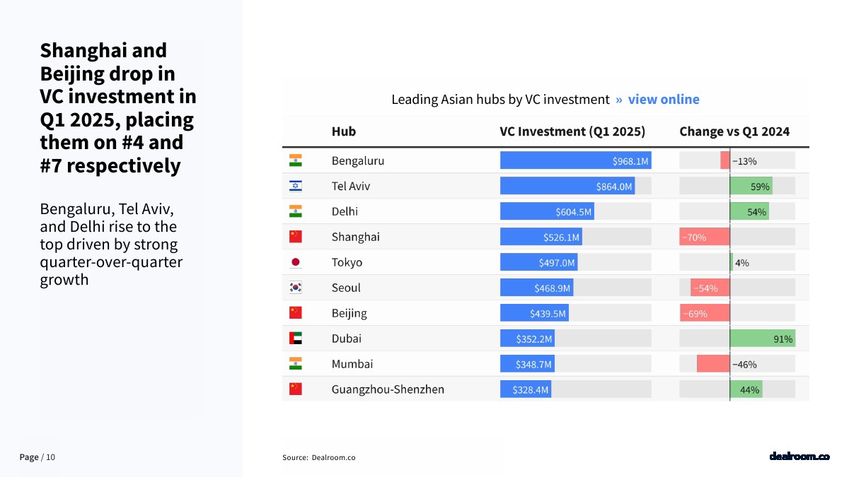 上海和北京风投排名下滑至第四和第七位,班加罗尔、特拉维夫和德里凭借强劲的季度增长跃居前列。