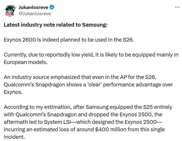 不过由于产能较低,三星只会在欧版Galaxy S26系列上使用Exynos 2600,这意味着国行版、美版Galaxy S26系列仍然搭载高通芯片,预计是骁龙8 Elite 2。