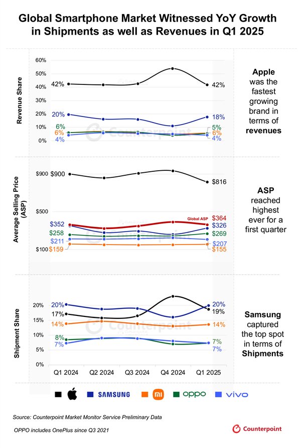 市场调研机构Counterpoint最新的数据显示,20205年第一季度全球智能手机行业,苹果凭一己之力赚走了近50%的收入。