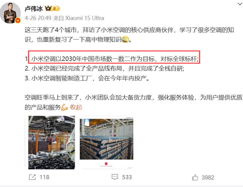 当卢伟冰宣布小米空调要冲击中国市场的“数一数二”时,整个家电行业的神经骤然紧绷。这个曾被传统巨头视为"门外汉"的互联网品牌,如今已悄然跻身空调市场前四,并持续加速度向头部阵营冲刺。