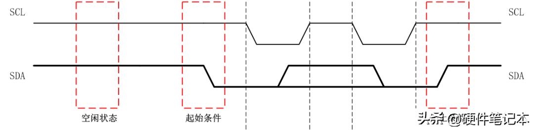 起始条件:SCL为高电平时,SDA由高电平向低电平切换;表示开始传送数据。
