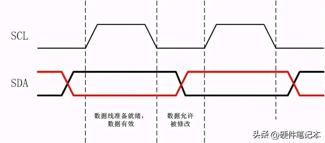 I2C总线在传输数据都是按照bit来传送。SCL为时钟线,SDA为数据线;在SCL时钟线为高电平时,SDA数据线上的电平不允许被修改,SCL时钟线为低电平时,SDA数据线上的电平可为高/低。