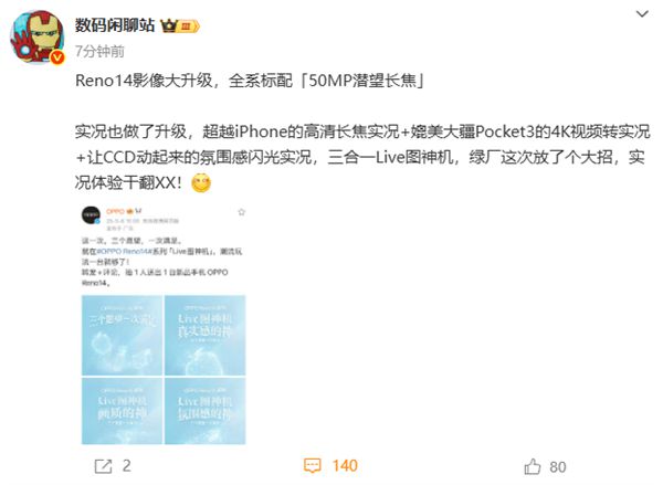 据数码博主"数码闲聊站"透露,Reno14影像大升级,全系标配5000万像素潜望长焦镜头。