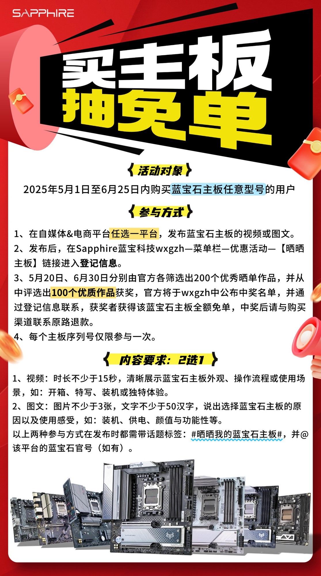 以上两种参与方式在发布时都需带话题标签:#晒晒我的蓝宝石主板#,并@该平台的蓝宝石官号(如有)。