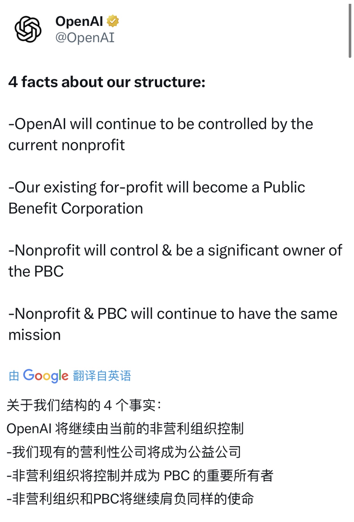 “OpenAI是作为非营利组织成立的,今天由该非营利组织监督和控制。今后,它将继续由该非营利组织监督和控制。”奥尔特曼在信中阐述了新的重组计划。