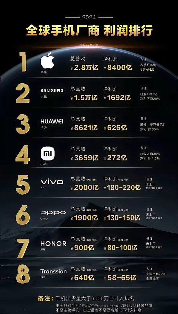 有博主统计汇总后揭晓了2024年全球手机厂商利润排名,行业呈现“一超多强”格局。