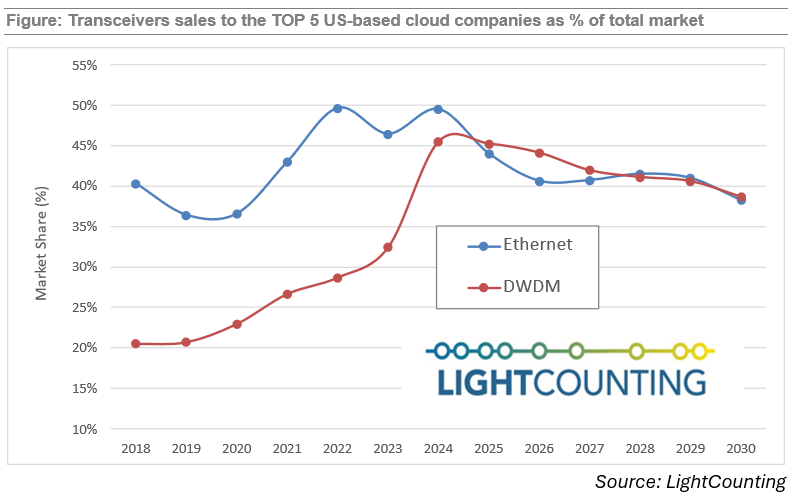 下图通过分析亚马逊、谷歌、Meta、微软和甲骨文这五大美国云公司的以太网和DWDM光模块采购情况来说明上述情况。在经历十余年稳定增长后,这些企业消耗的光器件市场份额将逐步下降。虽然其光模块采购支出仍会增长,但增速将落后于全球其他市场。