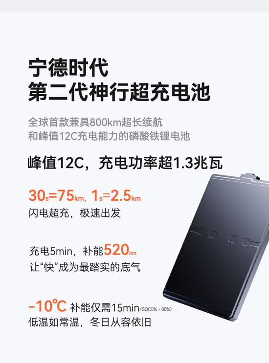 先说常规更新,宁王这次发布了号称 12C、800km 纯电续航的二代神行电池,号称 30 秒能充 75km ,合着一秒就是 2.5 公里,甚至在 -10℃ 的低温下从 10% 充到 80% 也只需15分钟。