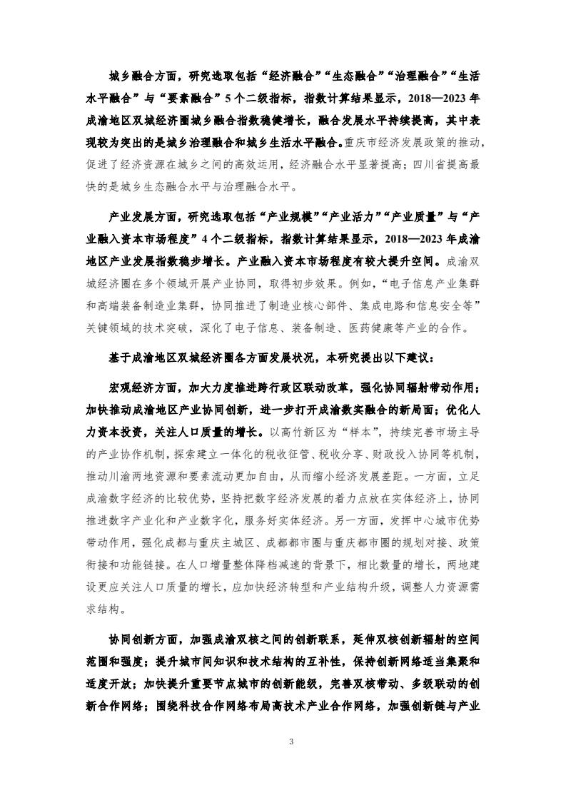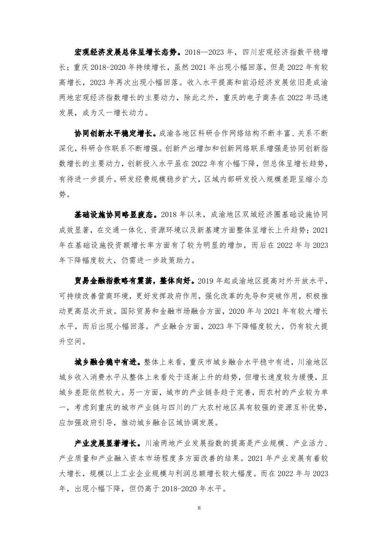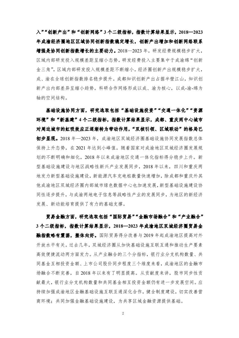 成渝地区双城经济圈发展总体向好,协同创新、基础设施协同、贸易金融与产业发展指数增长较快。宏观经济、协同创新、基础设施协同、贸易金融、城乡融合和产业发展6个一级指标在 2018-2023年间总体呈增长趋势,但仍存在内部发展不均衡的问题。