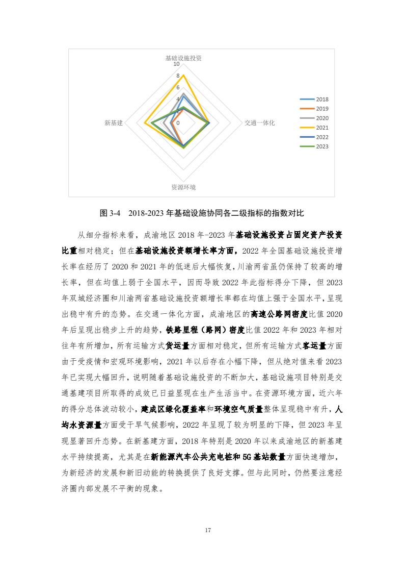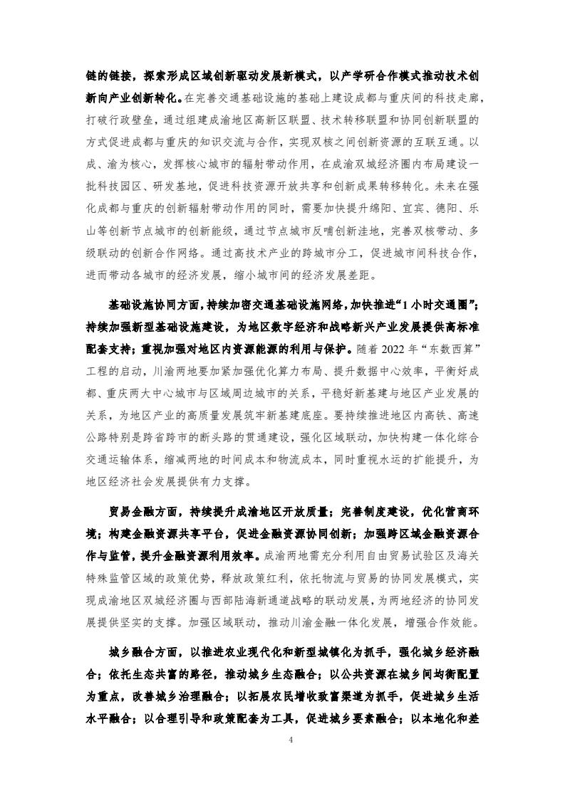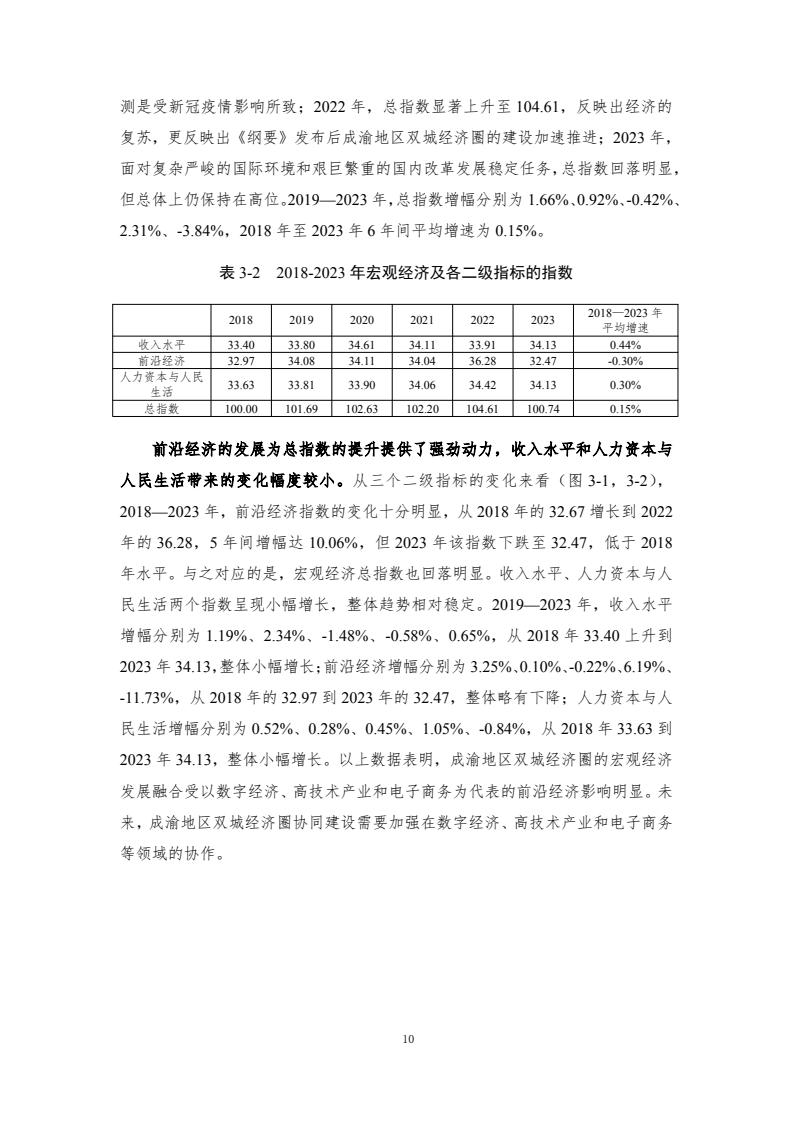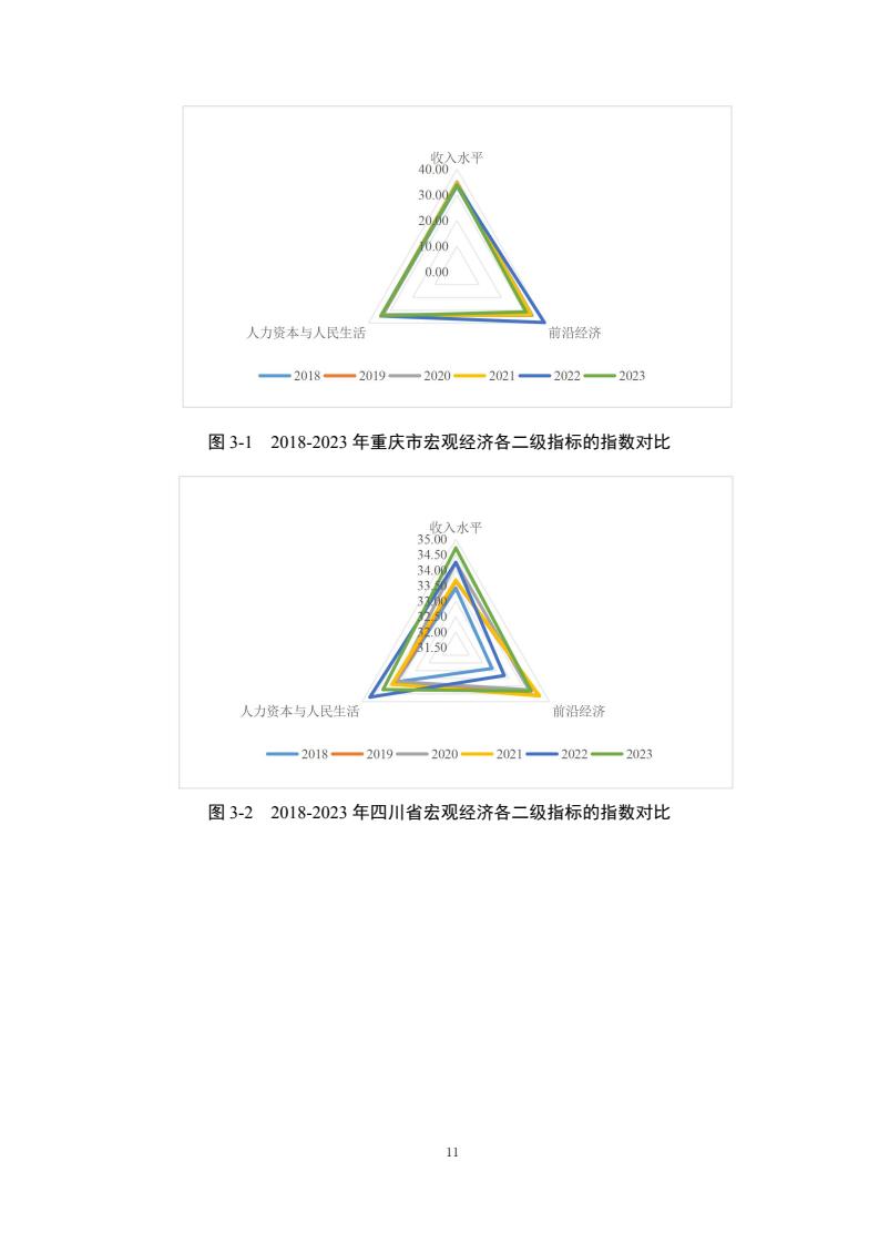 成渝地区双城经济圈发展总体向好,协同创新、基础设施协同、贸易金融与产业发展指数增长较快。宏观经济、协同创新、基础设施协同、贸易金融、城乡融合和产业发展6个一级指标在 2018-2023年间总体呈增长趋势,但仍存在内部发展不均衡的问题。
