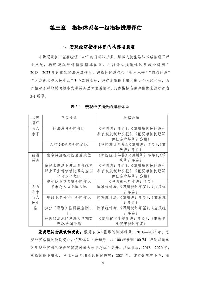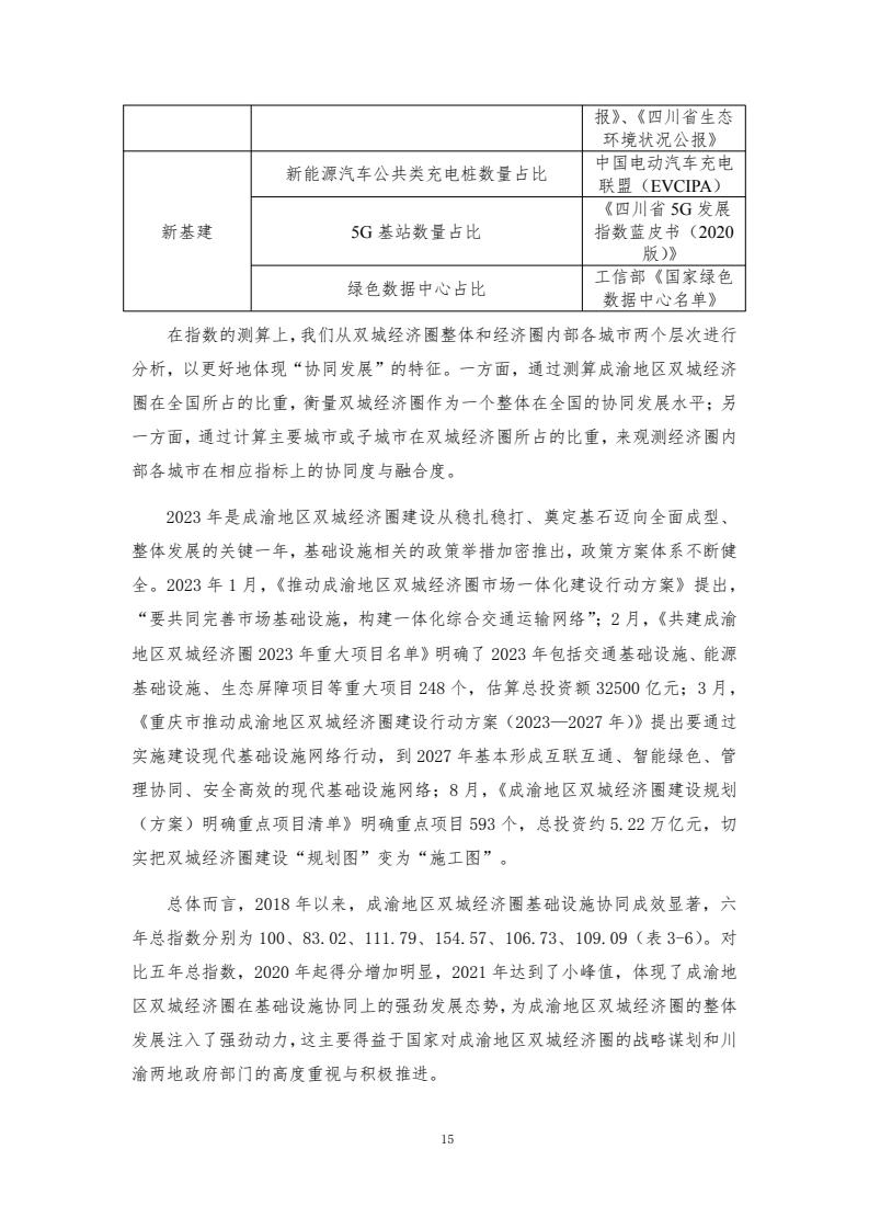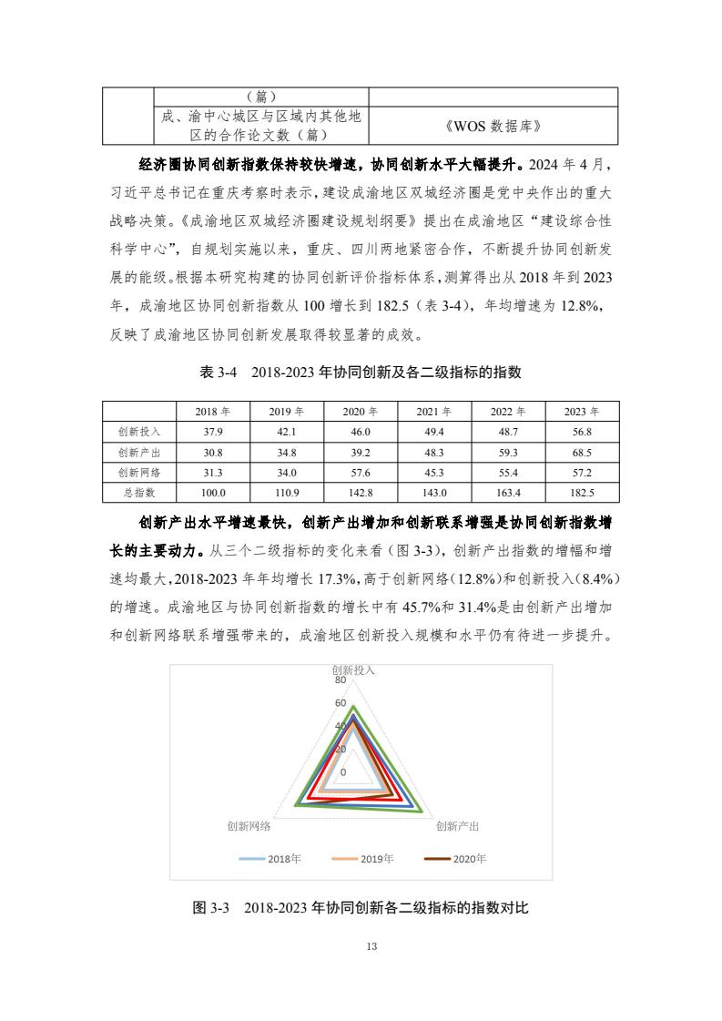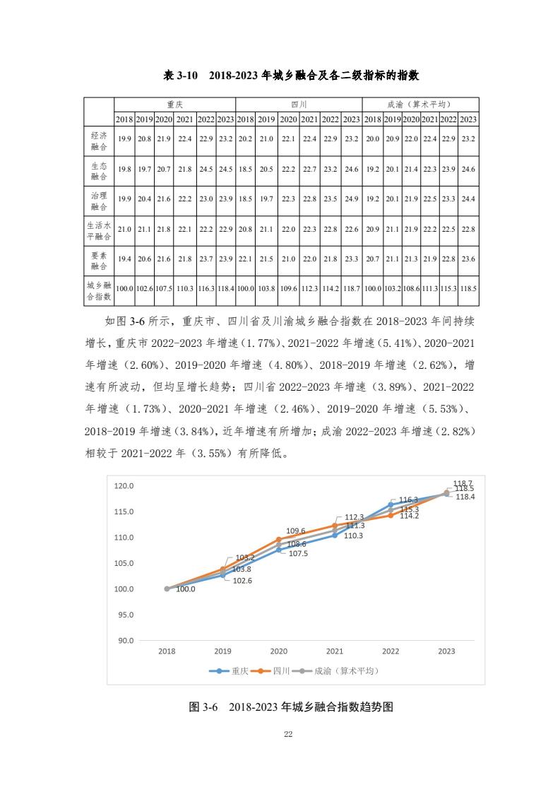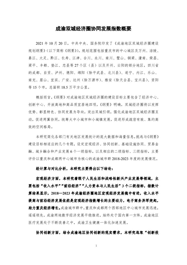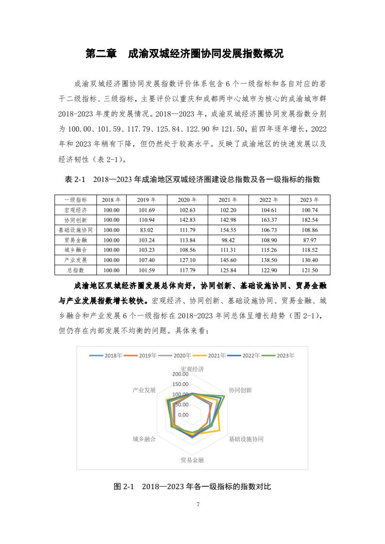 成渝双城经济圈协同发展指数评价体系包含6个一级指标和各自对应的若干二级指标、三级指标,主要评价以重庆和成都两中心城市为核心的成渝城市群2018-2023年度的发展情况。2018—2023年,成渝双城经济圈协同发展指数分别为100.00、101.59、117.79、125.84、122.90和 121.50,前四年逐年增长,2022年和2023年稍有下降,但仍然处于较高水平。反映了成渝地区的快速发展以及经济韧性。